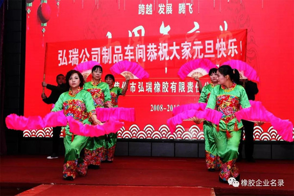12月31日,焦作市弘瑞橡膠有限公司在焦作蘇州園酒店舉辦隆重的十周年廠慶活動(dòng)。車間集體舞蹈、才藝演唱、喜劇小品、老式的三句半歡聲一片,員工們個(gè)個(gè)都以飽滿的熱情慶祝我們“弘瑞人”自己的節(jié)日。來自國內(nèi)各地嘉賓、客戶及供應(yīng)商與廠員工300多人共聚一堂,歡慶這一盛典。